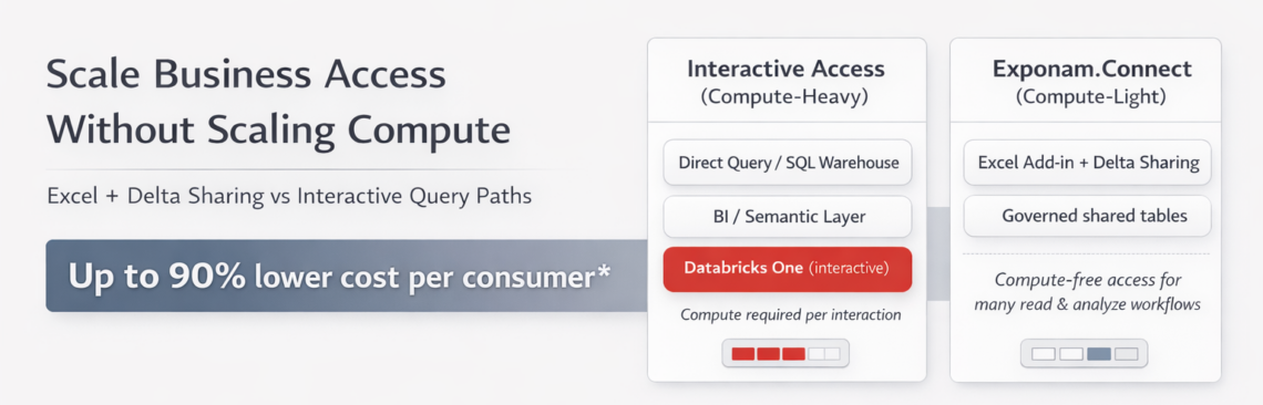 Exponam.Connect changes the equation by bringing governed Databricks data into Microsoft Excel using Delta Sharing, a protocol designed for secure data sharing across platforms. For many “read & analyze” workflows in Excel, Delta Sharing enables compute-free data access—meaning the long tail of business consumption can be served without provisioning additional interactive compute.